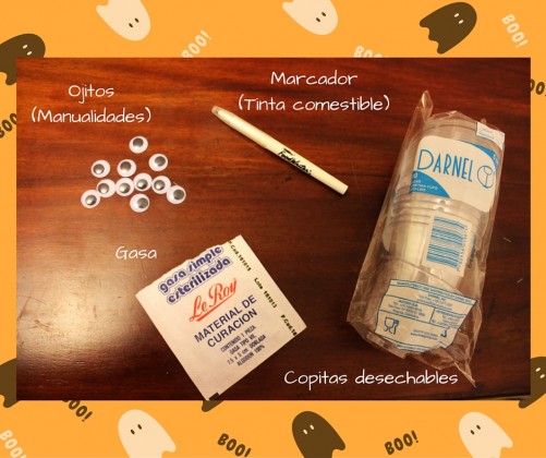 Solo tienes que cortar pedazos de gasa. Entre más irregulares sean mejor. Coloca los dos ojitos con silicón frío. El toque final será rellenar con gelatina de piña.