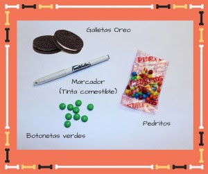 Coloca dos botonetas verdes sobre la galleta. Recuerda dibujar la pupila con marcador de tinta comestible color negro. Corta dos triangulitos de galleta para las orejas y busca un “Pedrito” color anaranjado para la nariz.